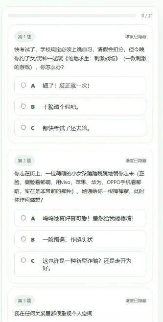 SBTI人格测试APP安卓版英文全称是【Silly Big Personality Test】简称SBTI,源自B站创作者蛆肉儿串儿的创意构思。这款近期走红的网络趣味测试,借用MBTI架构进行幽默解构,核心在于自嘲解压。结果生成带有随机性质,缺乏严谨心理学背书,仅供娱乐消遣,无法替代专业心理评估工具。访问软件或官网即可直接体验,全程免费,无需注册登录。题目包含约三十道生活场景选择题,耗时短暂,几分钟便能完成作答。操作流程极简,零门槛上手,为大众提供轻松愉快的玩梗体验,是闲暇时刻调节心情的理想选择。