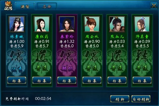 - 界面左下角显示免费刷新倒计时,每小时赠送一次刷新将领机会。冷却结束应立即使用。每次刷新呈现六名随机将领。冷却期间消耗仙石或礼券亦可刷新。通常手动刷新数次即可获取蓝色及以上品质散仙。自动刷新支持设定目标品质与上限次数。重点观察散仙的“潜力”与“资质”,二者直接决定战力高低。